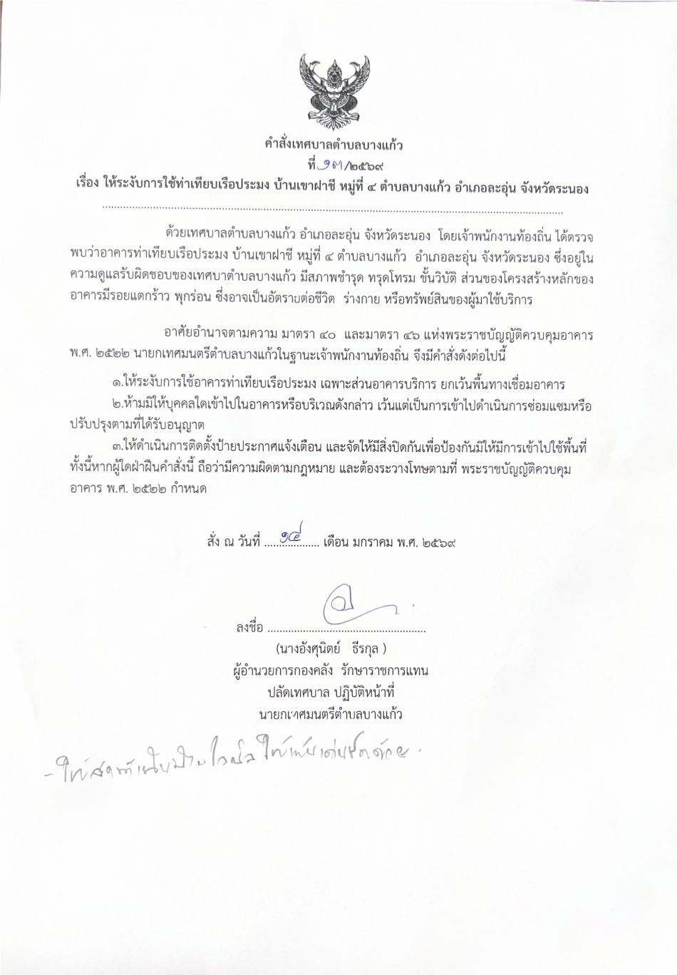 คำสั่งเทศบาลตำบลบางแก้ว ที่ 13/2569 เรื่อง ให้ระงับการใช้ท่าเทียบเรือประมง บ้านเขาฝาชี หมู่ที่ 4 ตำบลบางแก้ว อำเภอละอุ่น จังหวัดระนอง